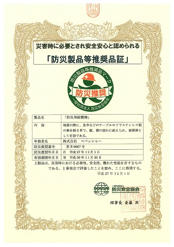 ![]() 大きく見る ◆防災用 (新)耐震棒オールステンレスの耐震棒を新発売! ![]() 各家庭の食卓等のテーブルにお使い下さい。 個人宅の他、多数の人が集う場所にも ダイニングテーブルの他、会議所、集会所等の机にもお使いください。 コバッシャーは床束 無溶接で強くて安く、安全な商品提供しています。