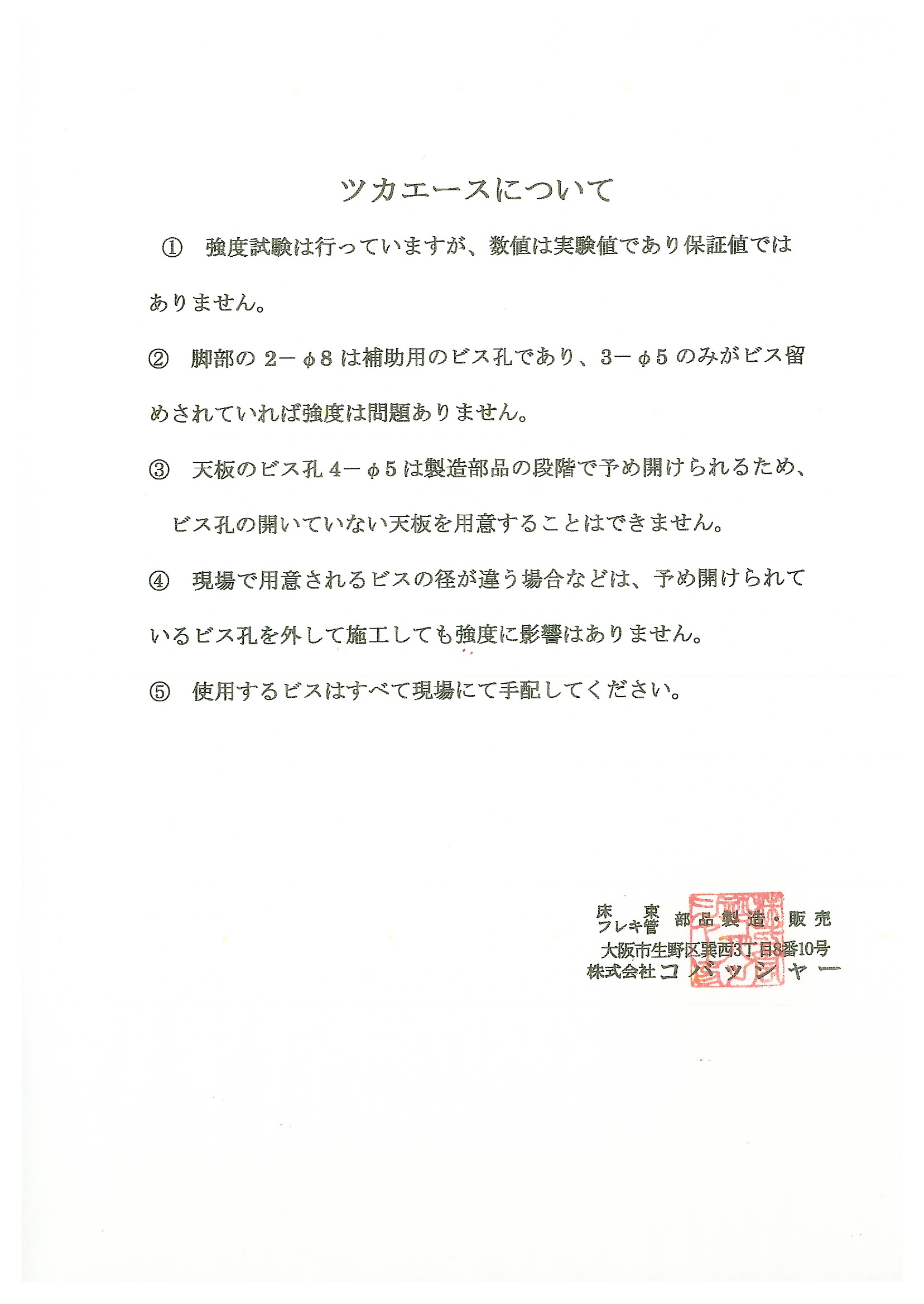 ■安心コスト ・・・・・・ ご予算に応じ 加工いたします ■コストの削減 ・・・・ 無駄をなくし使う用途分だけ購入できます ■確かな信頼 ・・・・・ 社内実験・強度テストを行っています ■簡単な取り付け ・・・・ 取り付けは簡単 ◆カシメの技術![]() ![]() ◆安心コスト ・ コスト削減補助構造材の床束は従来、樹脂、鋼製の材料で熔接や、ネジ等で高さを調整していますが、弊社のツカエースは湿気に強いステンレス製で縦、横揺れ等のテストでも高い評価を頂いております。